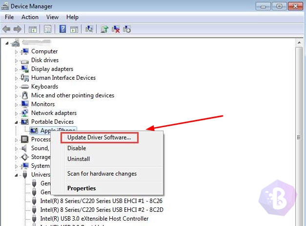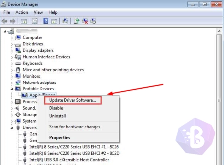 1- iPhone aygıtına sağ tıklayın ve içerik menüsünden Sürücü Yazılımını Güncelle seçeneğini seçin.