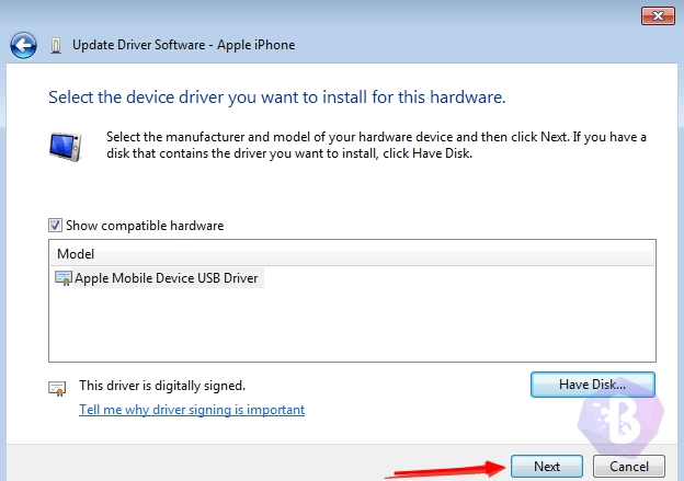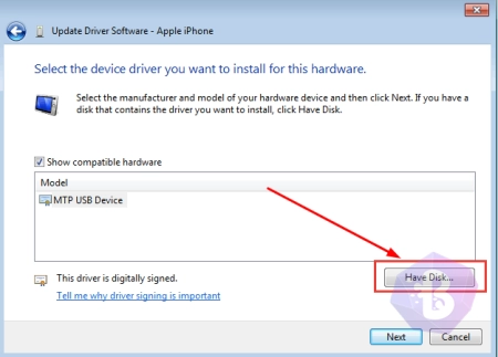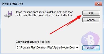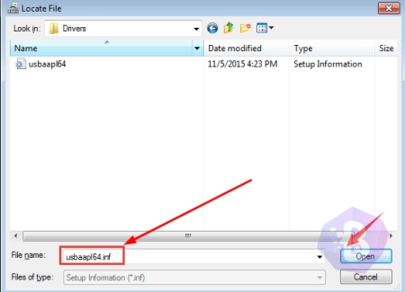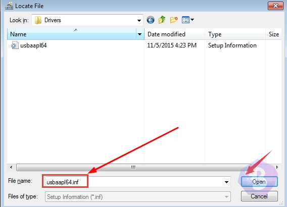 6- C: \ Program Files \ Common Files \ Apple \ Mobile Device Support \ Drivers’a gidin. “Usbaapl64.inf” dosyasını seçin, ardından Aç düğmesine tıklayın.
